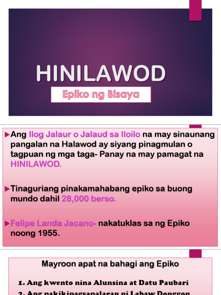 HINILAWOD Epiko ng Panay Ang buhay ay parang ilog May simula ay katapusan Minsan payapaminsan maalon ang agos Hindin tuwid ang pag agosmaraming pagdadaanan mga masasakit na alon. 7 Sesyon MGA KASANAYANG PAMPAGKATUTO SA BAWAT DOMAIN PAG-UNAWA SA NAPAKINGGAN PN F7PN-IIg-h-10 Natutukoy ang mahahalagang. Haraya Lagda Maragtas at Hinilawod.