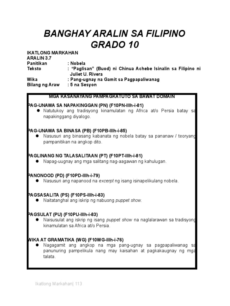 3 4 M Kwento Pdf Banghay Aralin Sa Filipino Grado 7 Ikatlong Markahan Aralin 3 4 Panitikan. Rivera Si Okonkwo isang matapang at respetadong mandirigma nagmula. Bigyan ng paliwanagV.