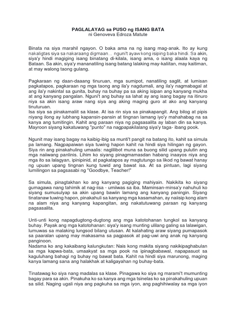 Ni Genoveva Edroza Matute. Sa Puso ng Isang Bata. Ni Genoveva-Edroza Matute Isang araw naigunita ng guro ang pagsasamang namuo sa kanila ng kanyang naging estudyante.