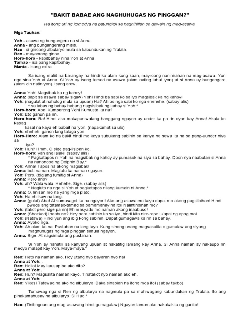 Human translations with examples. Isang Masining na Pagkukwento ni Sean Kieffer L. BAKIT BABAE ANG NAGHUHUGAS NG PINGGAN -isa itong uri ng komedya na patungkol sa dalawang pasaway na mag-asawa.