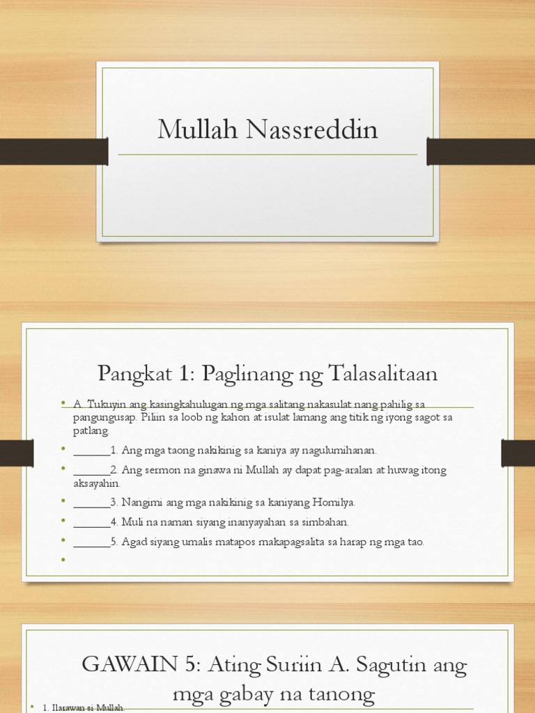 Tema ay ang pagtatalo ng mabuti at masama Marina Gonzaga-Merida. Mullah Nassreddin o Mulla Nassr-e Din. Mullah Nasreddin diskursong nagsasalaysay-Aralin 32.