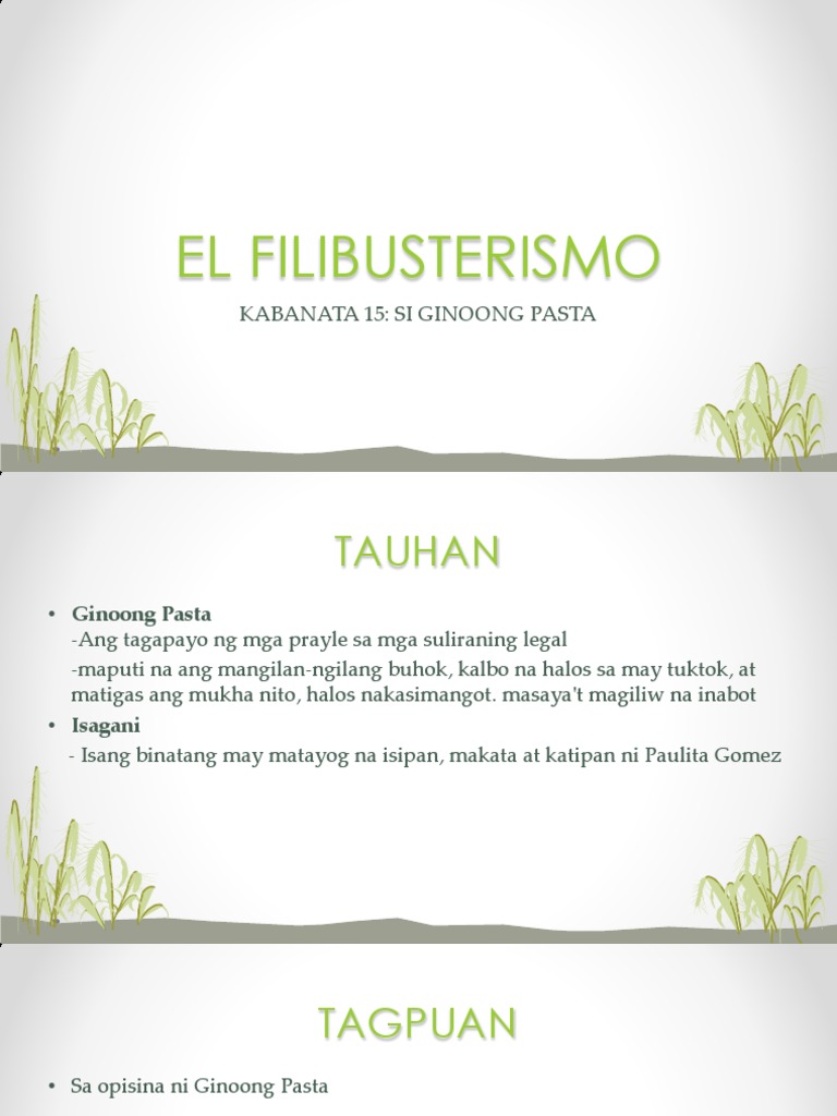 Kabanata 15 El Filibusterismo Si Ginoong Pasta BUOD KABANATA 15 EL FILIBUSTERISMO Narito ang buod ng Kabanata 15 ng El Filibusterismo na isinulat ni Jose Rizal. Sa Kubyerta Umaga ng Disyembre. Sinadya ito ni Isagani upang pakiusapan na kung maari ay mamagitan ng sang-ayon sa kanila kung sakaling sumangguni si Don Custodio.