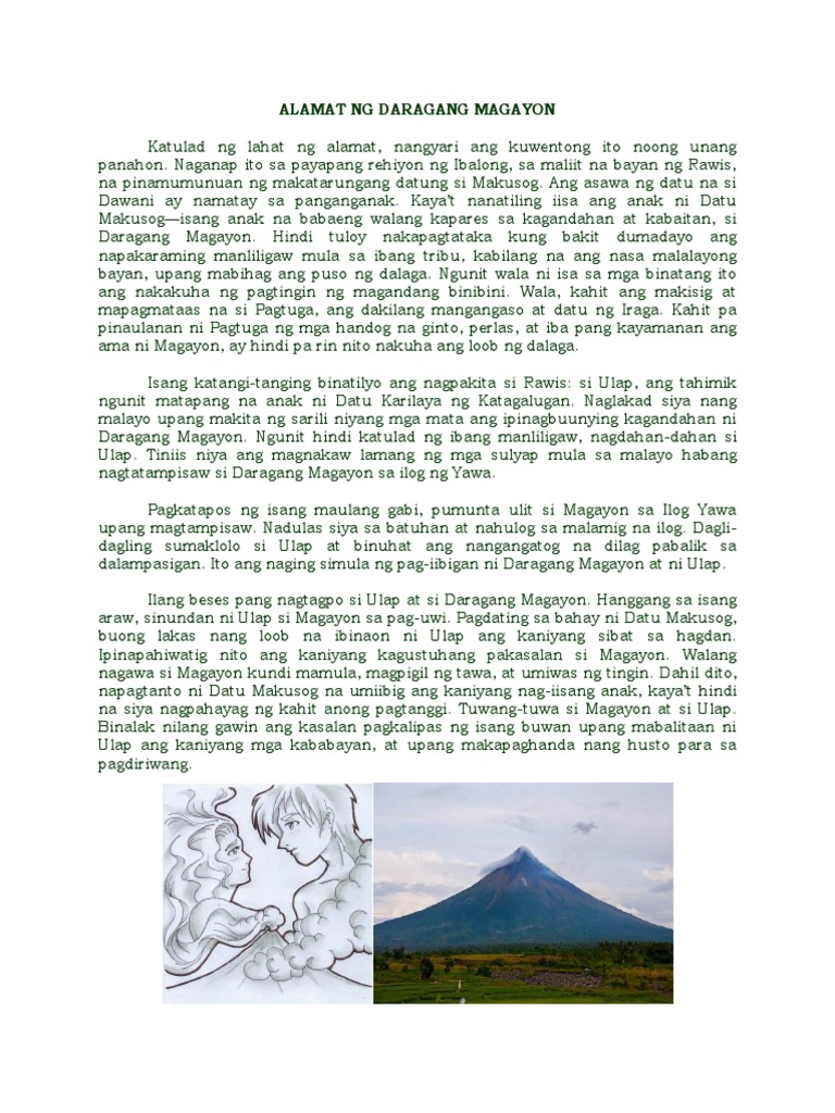 Pagbasa sa Kwento Alamat ni Daragang Magayon Katulad ng lahat ng alamat nangyari ang kuwentong ito noong unang panahon. She grew up to be a very beautiful. Ang alamat ng Daragang Magayon ay napakaloob sa isang dyanra na trahedya.
